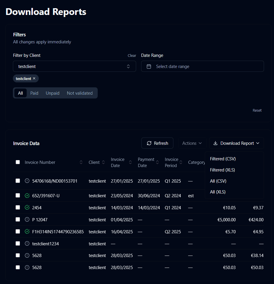 Automatically categorizes documents by client. Enables per-client insights, bulk actions, and exports.